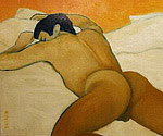 J'ai titré un tableau "bleu blanc rouge", parce que je l'ai peint avec seulement trois tubes, un tube de bleu, un tube de blanc et un tube de rouge. J'ai passé dix minutes pour ce faire et je me suis dit qu'il fallait que j'arrête. Y consacrer plus de temps n'aurait servi à rien, j'avais raconté l'histoire. Ça me semble être une des choses les plus érotiques que j'ai peintes. Juste un élan. Un mec est allongé sur un lit et attend... Il a un prénom qui commence par un J. Un gentil garçon, quinquagénaire maintenant, que je revois parfois...