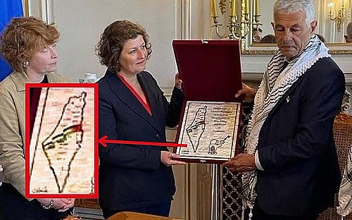 Comme cadeau elle a accepté cette carte où il n'y a que la Palestine de la rivière jusqu'à la mer. Ce qu'elle affiche par ce geste symbolique, cette femme, c’est l’effacement même d’Israël et de ses dix millions d'habitants, l'effacement de sa place sur la carte du monde, l'effacement de son apport civilisationnel, de sa population dans toute sa diversité, juive, musulmane, chrétienne, bédouine, druze, athée.